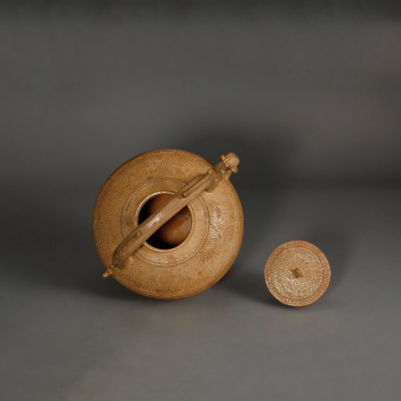这件三足盉的腹部一侧安兽首短流作龙首,另侧塑出龙尾,肩部置提梁且出戟作为龙身,构成一连贯的龙形。这一造型仿自同时期的铜提梁盉,是反映吴越贵族礼乐制度及丧葬习俗的重要实物。该器制作精美,造型、纹饰、胎釉等都代表了战国原始瓷器的较高水平。